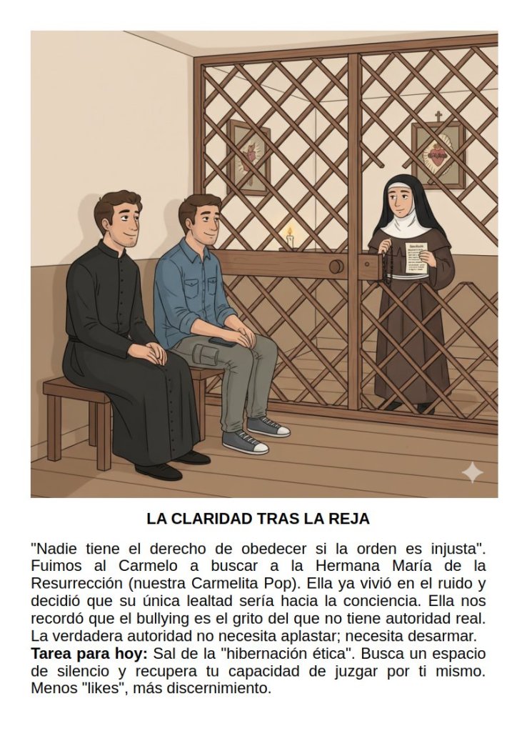 SR. MARÍA (Carmelita Pop): —Exacto. Díganles a esos chicos que la verdadera autoridad no necesita gritar. El narcisista crea una realidad inventada donde él es el centro. Ustedes deben devolverlos a la realidad material. El bullying se cura tocando el dolor ajeno. Desafíen su «trance hipnocrático» con el encuentro real. Que dejen de obedecer a la «colmena» del odio y empiecen a obedecer a su conciencia.