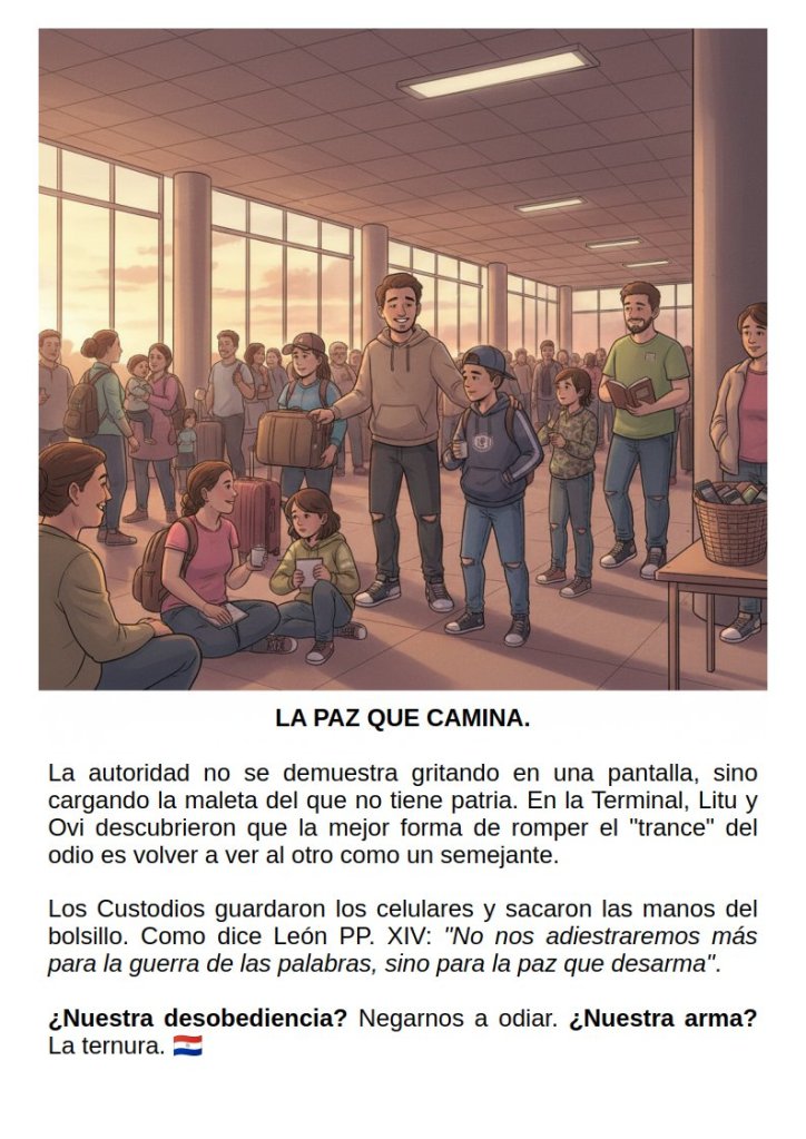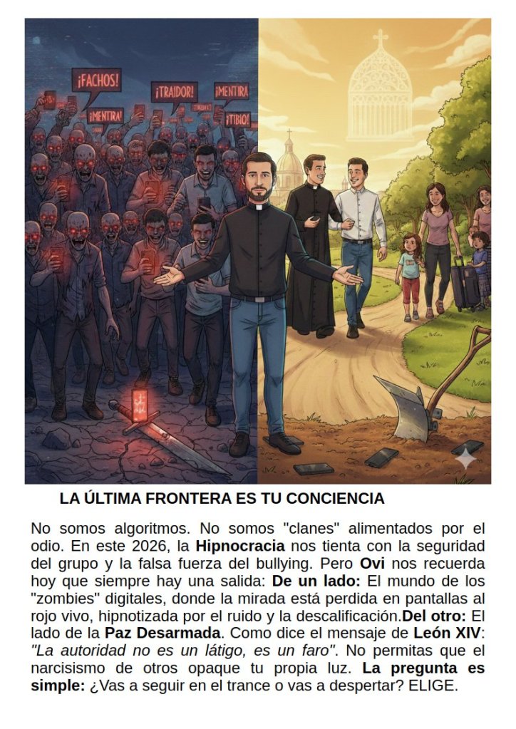 P. OVI: —Vamos a hacer un «ayuno de bullying». Como dice León XIV, vamos a desarmar el lenguaje. El que use un insulto en el grupo, pierde el celular por un día y se va a ayudar a la Pastoral Social. Vamos a cambiar la «Hipnocracia» del Like por la Auctoritas del servicio.