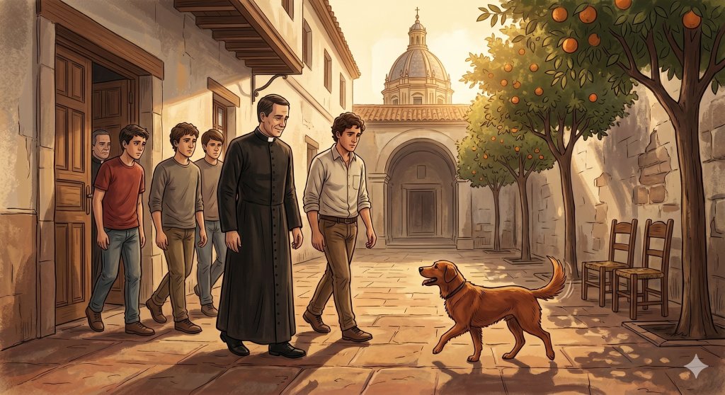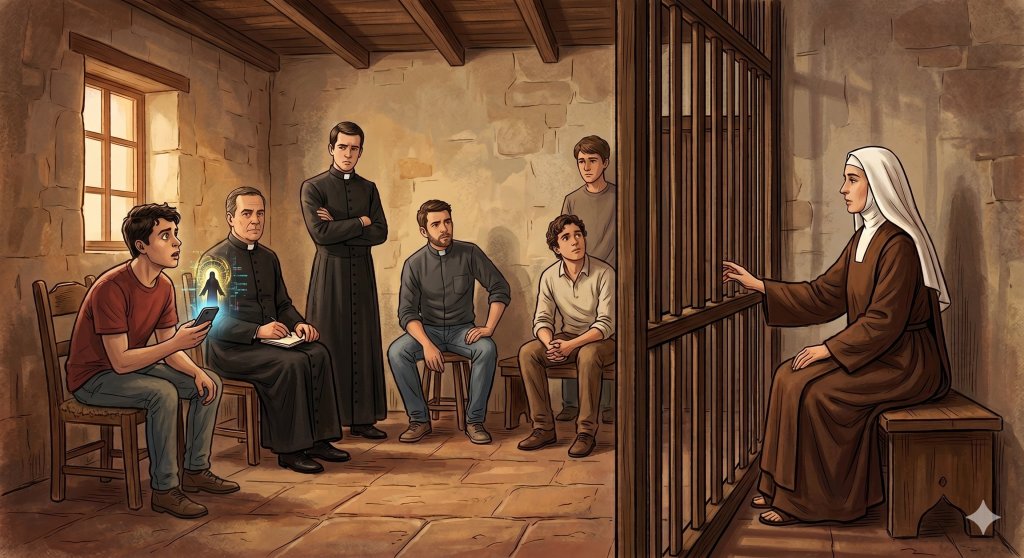 El locutorio del Carmelo olía a madera y a silencio guardado. Una reja de madera oscura dividía el espacio en dos: de un lado, la Hermana María de la Resurrección, con su hábito color tierra y una sonrisa que no necesitaba filtros. Del otro, P. Lorenzo en su silla, Litu tieso como siempre, Ovi con la gorra al costado por respeto, y tres Custodios Reguetoneros que no sabían bien dónde poner las manos.