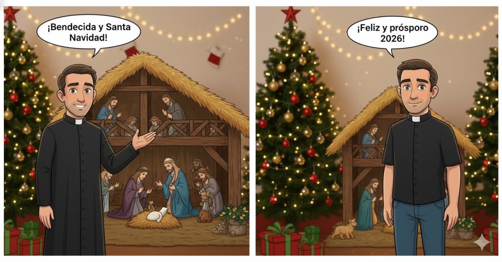 AMBIENTE: La parroquia está decorada festivamente, preparándose para Año Nuevo. Hay un pesebre grande cerca del altar. La iglesia está llena y hay mucho ruido de fondo (bebés, murmullos).